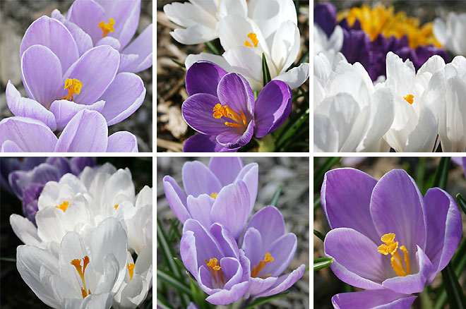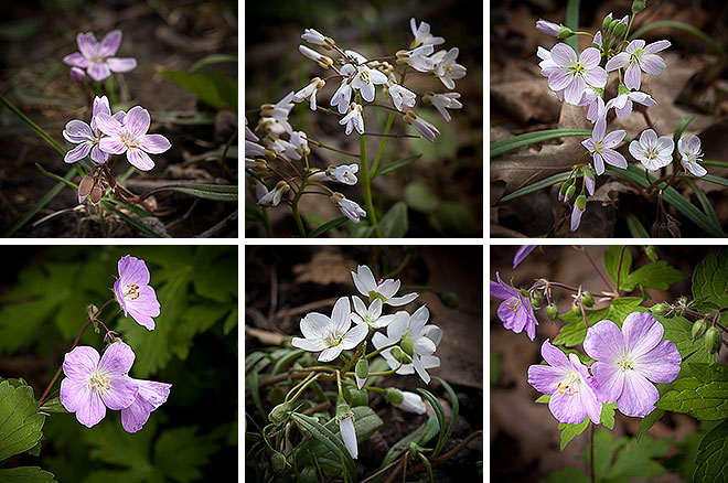 (l-r) Claytonia virginica (Spring Beauty), Cardamine bulbosa (Spring Cress), Claytonia virginica (Spring Beauty), Geranium maculatum (Wild Geranium), Claytonia virginica (Spring Beauty), Geranium maculatum (Wild Geranium)