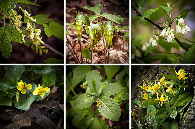 (l-r) Erythronium albidum (White Trout Lily), Ribes americanum (American Black Currant), Cardamine bulbosa (Spring Cress), Dentaria laciniata (Cut-leaf Toothwort), Lindera benzoin (Spicebush), Arisaema triphyllum (Jack-in-the-Pulpit)