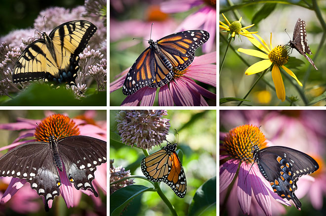 Eastern Yellow Swallowtail on Joe Pye Weed, Monarch on Purple Coneflower, Black Swallowtail on Tall Sunflower, Spicebush Swallowtail on Purple Coneflower, Monarch on Milkweed, Spicebush Swallowtail on Purple Coneflower