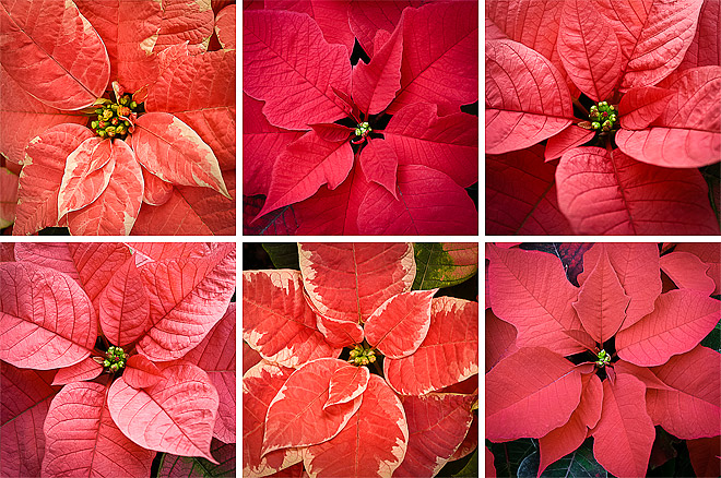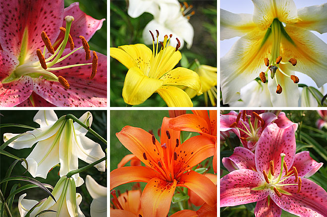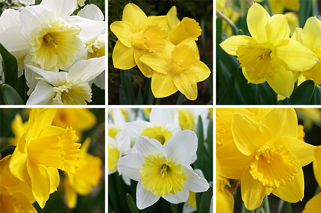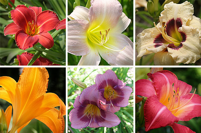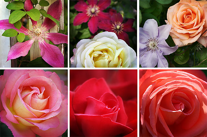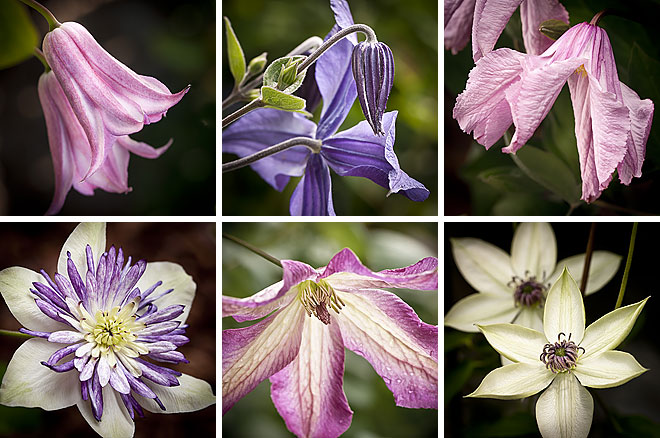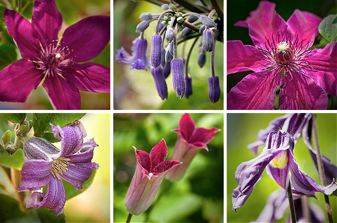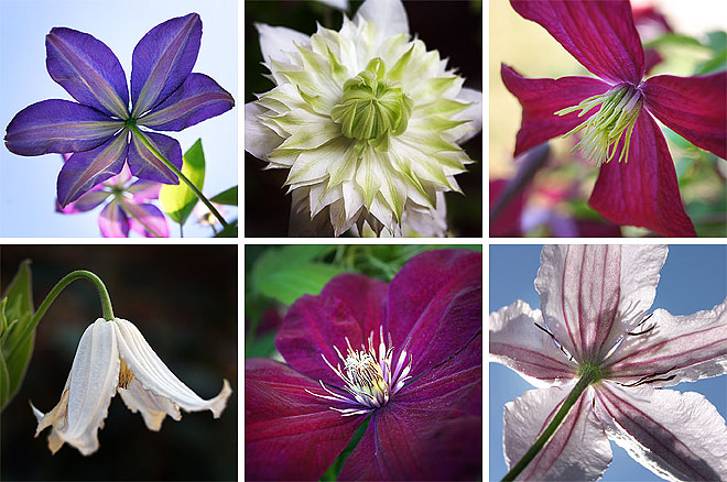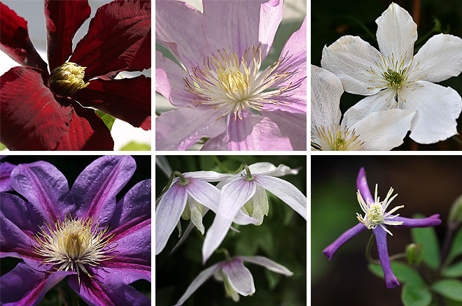 (l-r) C. x 'Andromeda'; C. integrifolia 'Gazelle'; C. x 'Rouge Cardinal'; C. florida 'Flore Pleno'; C. x 'The President'; C. viticella 'Madame Julia Correvon'
