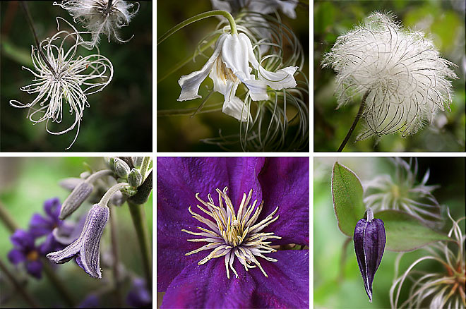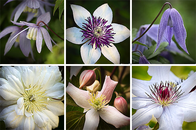 (l-r) C. macropetala 'Blue Bird'; C. florida 'Sieboldii'; C. alpina 'Frances Rivis'; C. x 'Duchess of Edinburgh'; C. montana rubens 'Pink Perfection'; C. x 'Snow Queen'