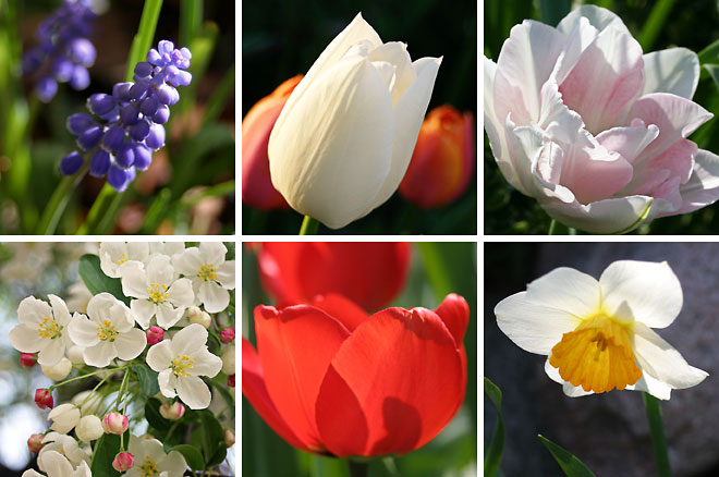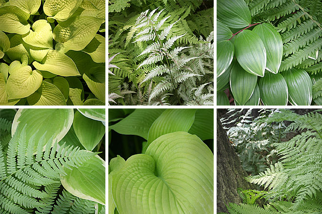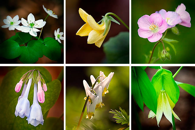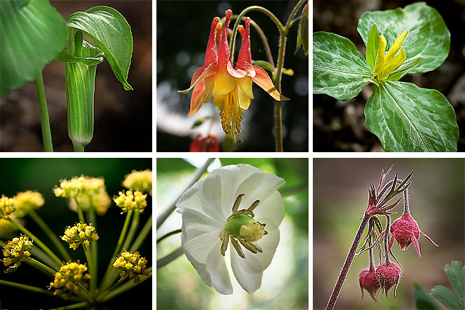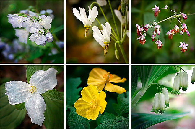 (l-r) Polemonum reptans (Jacob's Ladder), Dodecatheon meadia (Shooting Star), Thalictrum dioicum (Early Meadow Rue), Trillium grandiflorum (Large-flowered Trillium), Stylophorum diphyllum (Wood Poppy), Polygonatum biflorum (Smooth Solomon's Seal)