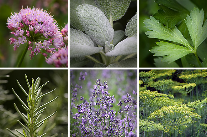 (l-r) Allium schoenoprasum (Chives), Salvia officinalis (Garden sage, Common sage), Petroselinum crispum (Garden Parsley), Rosmarinus officinalis (Rosemary), Lavandula augustafolia Hidcote (Lavender Hidcote), Anethum graveolens (Dill Weed)