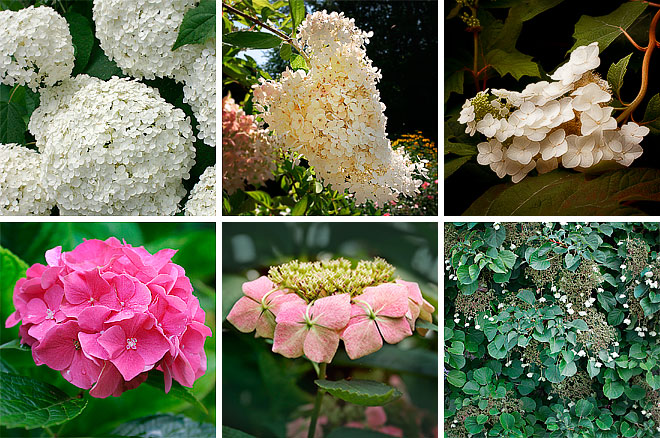 (l-r) Hydrangea arborescens 'Annabelle' (Annabelle Hydrangea), Hydrangea macrophylla (Bigleaf Hydrangea), Hydrangea serrata (Mountain Hydrangea), Hydrangea paniculata 'Tardiva' (Panicle Hydrangea), Hydrangea quercifolia (Oakleaf Hydrangea), Hydrangea anamola sbsp. petiolaris (Climbing Hydrangea)