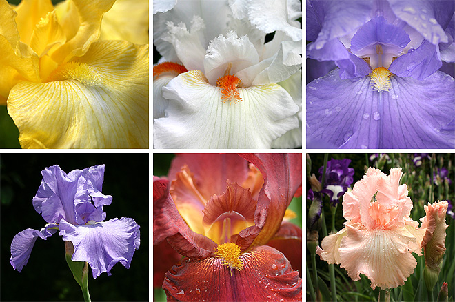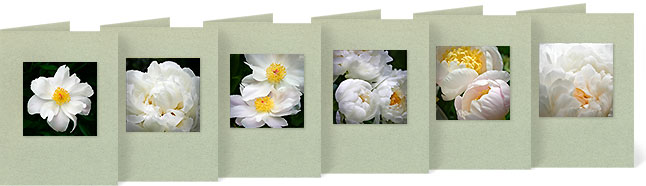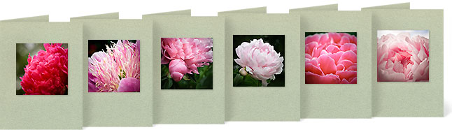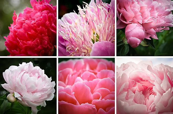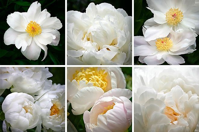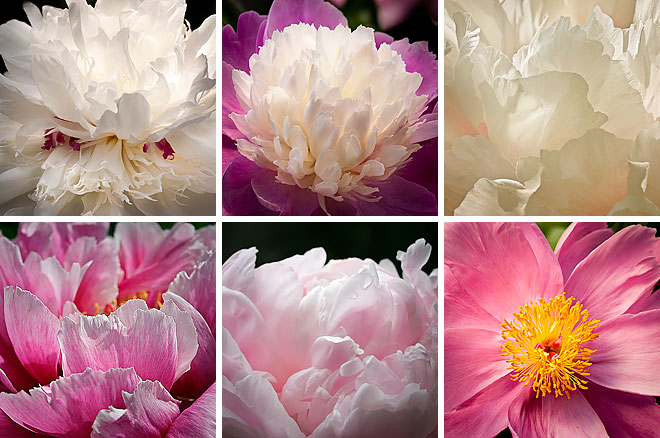 (l-r) Paeonia lactifolia 'Festiva Maxima'; Paeonia lactiflora 'Santa Fe'; Paeonia suffruticosa 'Renkaku'; Paeonia suffruticosa 'Kamata-Nishiki'; Paeonia lactiflora; Paeonia lactiflora 'Doreen'