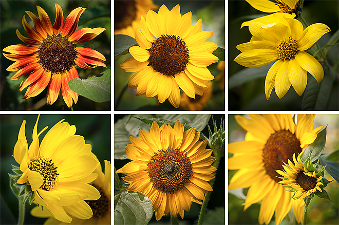 (l-r) Helianthus annuus (Annual Sunflower), Helianthus annuus (Annual Sunflower), Helianthus giganteus (Tall Sunflower), Helianthus mollis (Downy Sunflower), Helianthus annuus (Annual Sunflower), Helianthus annuus (Annual Sunflower)