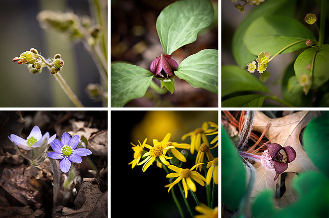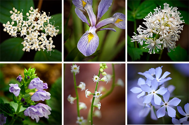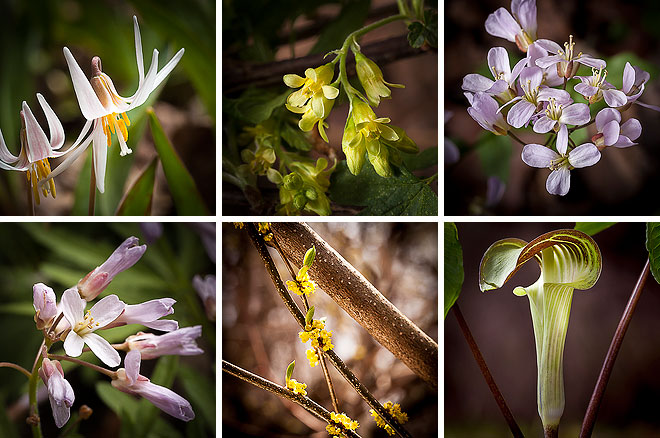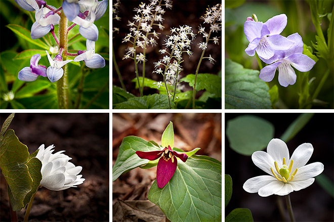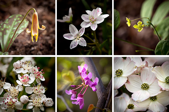 (l-r) Erythronium americanum (Yellow Fawn Lily), Claytonia virginica (Spring Beauty), Caulophyllum thalictroides (Blue Cohosh), Aronia melanocarpa (Black Chokeberry), Cercis canadensis (Eastern Redbud), Cornus florida (Flowering Dogwood)