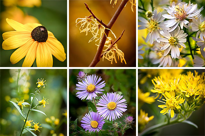 (l-r) Rudbeckia hirta (Black Eyed-susan), Hamamelis virginiana (Common Witch-hazel), Aster cordifolius (Heart Leaved Aster), Solidago flexicaulis (Zigzag Goldenrod), Aster novae-angliae (New England Aster), Solidago riddellii (Riddell's Goldenrod)