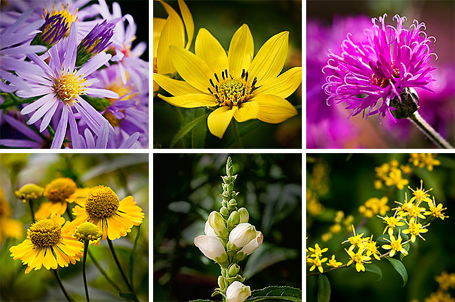 (l-r) Aster laevis (Smooth Aster), Helianthus giganteus (Tall Sunflower), Vernonia missurica (Missouri Ironweed), Helenium autumnale (Sneezeweed), Chelone glabra (Turtlehead), Solidago caesia (Bluestem Goldenrod)
