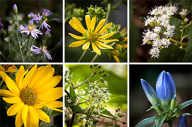 (l-r) Symphyotrichum oolentangiense (Skyblue aster), Silphium integrifolium (Rosinweed), Ageratina altissima/Eupatorium rugosum (White snakeroot), Helianthus mollis (Downy Sunflower), Aralia racemosa (American spikenard), Gentiana andrewsii (Bottle Gentian)