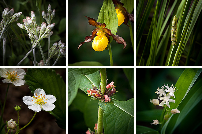 (l-r) Antennaria plantaginifolia (Pussytoes), Cypripedium pubescens (Yellow Lady's Slipper), Acorus calamus (Sweet Flag), Fragaria virginiana (Virginia Strawberry), Triosteum aurantiacum (Orange-fruited Horse Gentian), Smilacina stellata (Starry False Solomon's Seal)