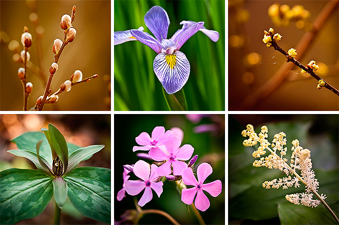 (l-r) Salix discolor (Pussy Willow), Iris virginica (Southern Blue Flag), Lindera benzoin (Spicebush), Trillium recurvatum (Prairie Trillium), Phlox pilosa (Downy Phlox), Smilacina racemosa (False Solomon's Seal)