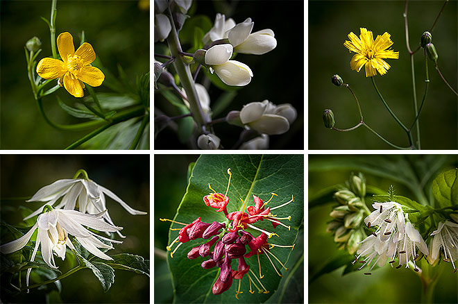 (l-r) Ranunculus septentrionalis (Swamp Buttercup) Baptisia alba (Wild White Indigo) Hieracium venosum (Rattlesnake Weed) Clematis occidentalis (Early Virgin's Bower) Lonicera dioica (Red Honeysuckle) Hydrophyllum virginianum (Virginia Waterleaf)