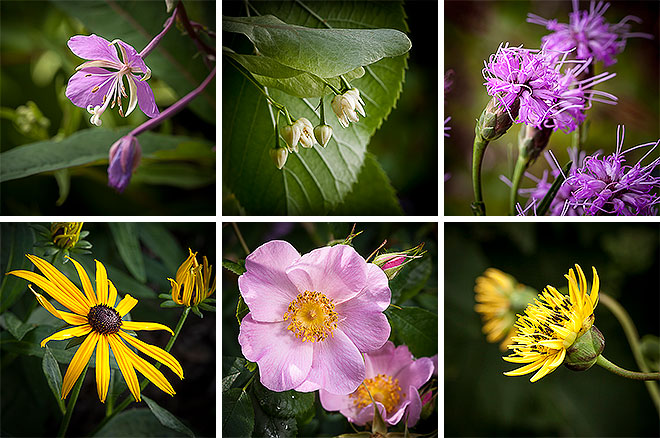 (l-r) Chamerion angustifolium (Fireweed), Tilia americana (Basswood), Liatris cylindracea (Cylindrical Blazingstar), Rudbeckia fulgida (Orange Coneflower), Rosa carolina (Pasture Rose), Silphium terebinthinaceum (Prairie Dock)