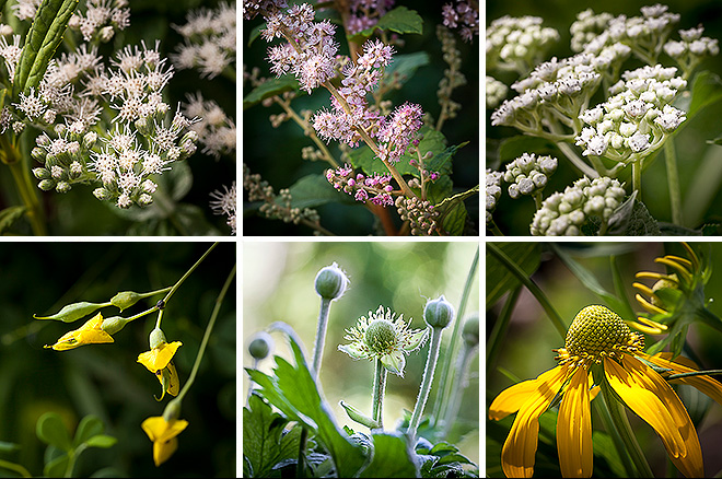 (l-r) Eupatorium perforatum (Boneset), Spiraea tomentosa (Steeplebush), Parthenium integrifolium (Wild Quinine), Baptisia tinctoria (Yellow Wild Indigo), Anemone virginiana (Thimbleweed), Rudbeckia laciniata (Cutleaf Coneflower)
