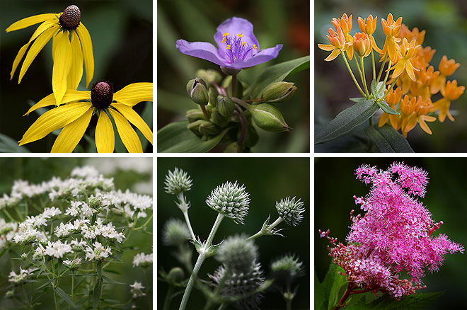 (l-r) Ratibida pinnata (Gray Headed Coneflower), Tradescantia ohiensis (Spiderwort), Asclepias tuberosa (Butterfly Milkweed), Pycnanthemum virginianum (Virginia Mountain Mint), Eryngium yuccifolium (Rattlesnake Master), Filipendula rubra (Queen of the Prairie)
