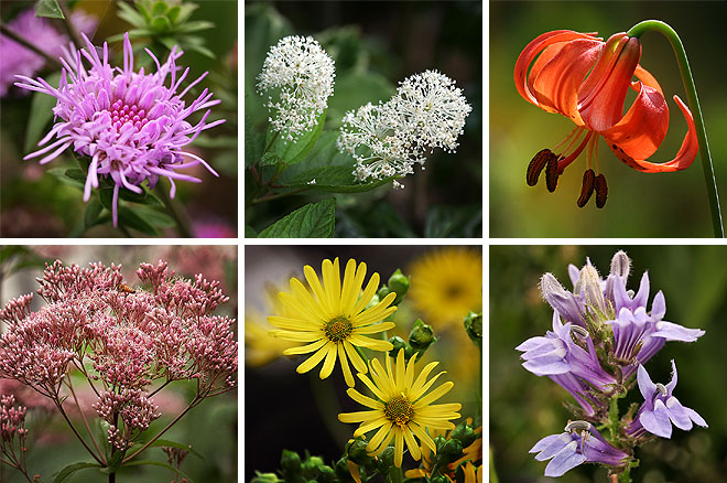 (l-r) Eupatorium purpureum (Joe Pye Weed), Anaphalis margaritacea (Pearly Everlasting), Allium cernuum (Wild Nodding Onion), Rudbeckia fulgida (Orange Coneflower), Chelone glabra (White Turtlehead), Pseudognaphalium obtusifolium (Sweet Everlasting)