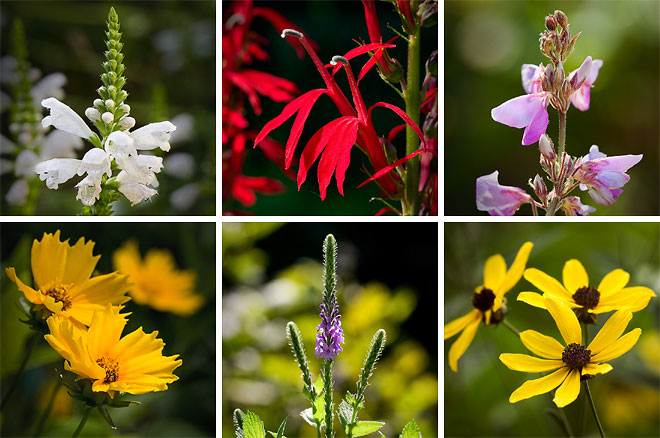 (l-r) Physostegia virginiana (Obedient Plant), Lobelia cardinalis (Cardinal Flower), Desmodium canadense (Showy Tick Trefoil), Coreopsis lanceolata (Lanceleaf Coreopsis), Verbena stricta (Hoary Vervain), Coreopsis tripteris (Tall Coreopsis)