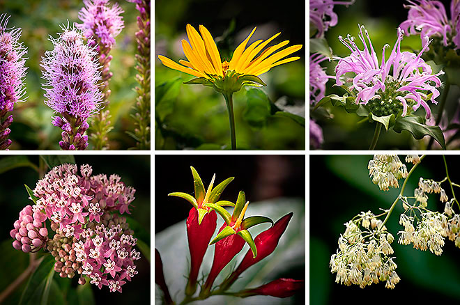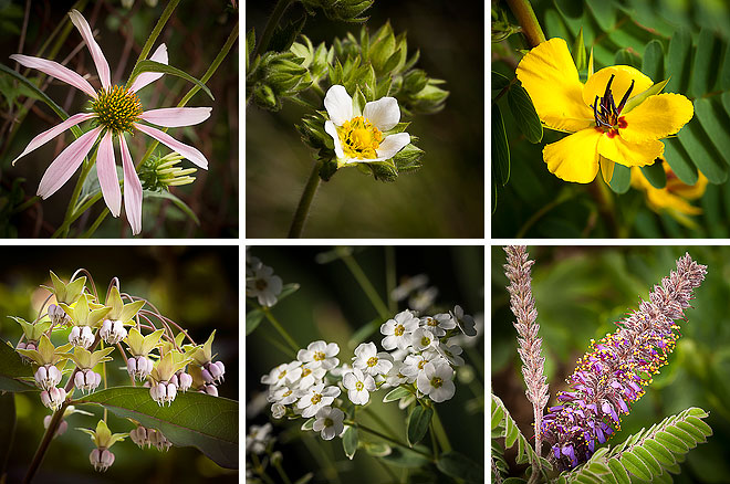 (l-r) Echinacea pallida (Pale Purple Coneflower), Potentilla arguta (Tall Cinquefoil), Chamaecrista fasciculata (Partridge Pea), Asclepias exaltata (Poke Milkweed), Euphorbia corollata (Flowering Spurge), Amorpha canescens (Lead Plant)