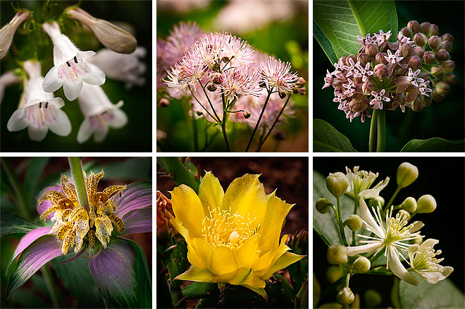 (l-r) Penstemon digitalis (Foxglove Penstemon), Thalictrum dasycarpum (Purple Meadow Rue), Asclepias syriaca (Common Milkweed), Monarda punctata (Dotted Horsemint), Opuntia humifusa (Eastern Prickly Pear Cactus), Clematis virginiana (Virgin's Bower)