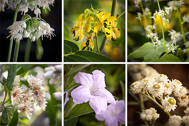 (l-r) Allium cernuum (Nodding Wild Onion), Cassia hebecarpa (Wild Senna), Echinocystis lobata (Wild Cucumber), Pseudognaphalium obtusifolium (Sweet Everlasting), Ruella humilis (Wild Petunia), Anaphalis margaritacea (Pearly Everlasting)