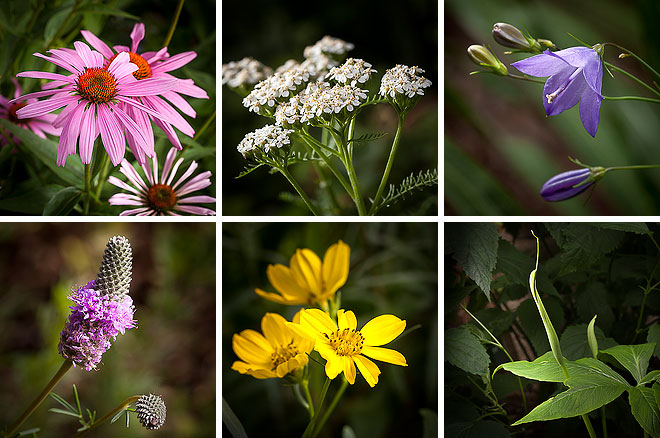 (l-r) Echinacea purpurea (Purple Coneflower), Achillea millefolium (Common Yarrow), Campanula rotundifolia (Bluebell Bellflower), Dalcea purpurea (Purple Prairie Clover), Coreopsis palmata (Stiff or Palm Tickseed), Arisaema dracontium (Green Dragon)